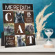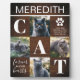 Gedenktafel für Haustiere mit 4 Fotos von Ihnen geliebten Kätzchen, rustikalem Holzmuster-Hintergrund, Buchstaben, die CAT ausdrücken, die Worte "für immer in unseren Herzen", eine Katze mit einem Gedächtnis-Sprichwort, und ihren Namen.