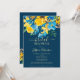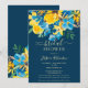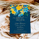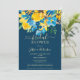 Eine elegante, rustikale Frühling- und Sommergelbe Sonnenblumen, blaue Rose und Grünpflanzen verlasse ein florales Aquarell-Brautparty mit elegantem Script-Bürsten-Schriftart auf dunkeleditierbarem blauen Hintergrund. Ideal für eine gmädchenhafte, stilvolle Braut zum Feiern!