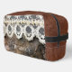 Die rustikale, große Toilettentasche im Stil eines Westerns, auch Dopp Kit genannt, hat einen dunkelgearbeiteten Lederhintergrund und eine antike Spitzentafel aus Imitaten mit einer Reihe von Perlen. Personalisieren Sie es mit der einfach zu bedienenden Vorlage. Der Schriftart ist vollständig anpassbar, wenn Sie gewollt haben, ein anderes Stilbild zu verwenden.