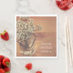Ein rustikales Hochzeitspapier-Serviette-Design mit einem Maurerglas voller Blume aus weißem Säugling auf Holzfußboden.