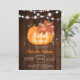 Rustikale goldfarbene Blumenleuchten fallen in die Party Einladung des Brautparty, die mit weißen Lichtern auf rustikalem Braunholz und einem handbemalten Orangenkürbis mit fallroten, braunen Blättern, Blume und Weizenstämmen mit einem modernen und eleganten Typografie mit Glitzer-Konfetti ausgestattet ist.