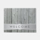 Eine rustikale Landhaus-Willkommens-Türmatte mit grauem hölzernem Plankenmusterhintergrund.