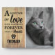 Eine rustikale und zeitlose Art, sich an Ihren geliebten Haustier zu erinnern, der traurig verstorben ist. Eine personalisierte Foto-Gedenktafel, mit einem Beileid Zitat, dass "Ein Leben der Liebe. Ihr Pflaster druckt ewig auf unseren Herzen.", ein heller Holzboden, ein niedliches weißes Herz in einem Plastdruck, Ihr Haustier und Ihre Daten. Laden Sie einfach ein Foto Ihrer Wahl hoch und machen Sie es zu einem wunderschönen Zuhause für die ganze Familie. Geeignet für Katzen oder Hunde.