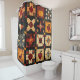 Dieser Duschvorhang ist mit einem rustikalen Patchwork-Quiltmuster versehen, das in einem gemütlichen Gitter aus Stoffblöcken angeordnet ist. Jeder Block präsentiert einzigartige Eigenmotive wie Kürbis, Vögel, Äpfel und Herzen, sowie komplizierte geometrische Muster wie Sterne, Quadrate und mit Blumen oder Schneeflocken inspirierte Designs. Der in warmen Erdtönen in Orange, Rot, Braun und Creme umrahmt von dunklem Hintergrund, fängt das Wesen der Herbst- und Erntezeit ein. Dieses volkstümliche Design im Bauernstil ist ideal für Erntedank-Dekoration, rustikales Kunsthandwerk, stofflich inspiriert Heimwerkerprojekte und landschaftliches Herbst-Zuhause-Design.