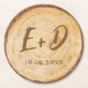 Für ein rustikales Hochzeitsthema. Der Hintergrund stellt eine braune Holzscheibe dar. Der gesamte Text ist braun. Es gibt 2 große Initialen von Braut und Bräutigam, vereint mit + Zeichen. Unter ihnen ist das Datum in kleineren Ziffern.