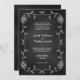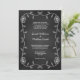 Rustikales Chaletbrett Hochzeitseinladungen mit Rand von Sonnenblumen und Weinreben, auf einem schwarzen Chalkboard Hintergrund. Niedliches handgezeichnetes Kreidebild ist perfekt für Ihre rustikale Themenhochzeit. Holen Sie sich die passenden Calkboard Hochzeit RSVP Karten.