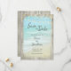 Rustikales Holz umrahmt ein Foto am Strand, in dem die Wellen zum Ufer abstürzen. Stringleuchten betonen die Oberseite. Elegantes Pinselskript kündigt Save the Date an, mit leicht personalisiertem Text, der die Einzelheiten Ihres zukünftigen Hochzeitstages enthält.
