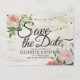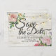 Hochzeit Sichern Sie das Datum Postkarten Vorlagen - Vintage Aquarellfarben Rosa Blume und elegante String-Lichter auf rustikalem Weiß Wash Soft Wood Texture Hintergrund. Ein perfektes Design für Ihren großen Tag! Alle Textstile, Farben, Größen können an Ihre Bedürfnisse angepasst werden.
