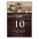 Rustikale Hochzeitskarte mit zwei Tischnummern aus Burgherzen und einem Stallholzhintergrund mit Lichtern und weißer Spitze.