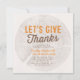 Feiern Sie Ihren Erntedank mit einer rustikalen Erntedank-Dinner-Einladung. Die stilvolle Einladung wird ergänzt durch eine orange und braun Vintage Typografie, die "Let's Give Danke", einen rustikalen Holzring-Hintergrund und einen benutzerdefinierten Text enthält. Ändern Sie Stil, Form und mehr des Schriftartes, um ein benutzerdefiniertes Aussehen zu erstellen.
