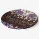 Hochzeitszeitung Teller in rustikalem Holzdesign mit lila und rosa Aquarellblumen und glitzernden Lichtern. Fügen Sie die Namen des Paares und das Hochzeitsdatum hinzu.