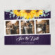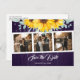 Rustikales lila und sonniges Hochzeitsfest-Foto Save the Date Postkarte mit einer Foto-Collage mit Aquarell Sonnenblumen und Grünpflanzen vor einem Stallholzhintergrund.