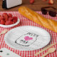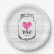 Weißes Stallholz Party Papier Teller mit Hochzeitsmonogramm plus Heiratsdatum. Grau-weiße Farben. Anpassbare Farbe und personalisierter Name Monogramm Anfangsbuchstaben von Braut und Bräutigam. Rustikale Typografie in Country chic Maurerkirsche Design. Niedlich romantisches Design mit Vintagem rosa Herzenssymbol. Symbol für verblichene Liebe Teller für die Hochzeit des Shabby Chic, das elegante Brautparty, die Verlobung, das Jubiläum oder den Junggeselinnen-Abschied. Anpassbare Hintergrundfarbe. Ideal für Hochzeiten im Freien im Sommer um Juli, August, September. Teil eines wunderschönen Sammlungsthemas mit Party-Vorräten und Papier-Vorlagen.