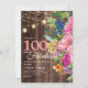 Schönes Rosa, Blau, Orange und Gelb Aquarell Blumen und Grün botanische 100 und fabelhafte 100. Geburtstagsfeier Einladung für Frauen auf einem rustikalen dunkelbraunen Holzboden mit Saitenleuchten und einem niedlichen kursiven Skript-Schriftart. Die Rückseite dieser Karte ist ein passender Holzhintergrund. Kontaktieren Sie uns für Hilfe bei der Anpassung oder um passende Produkte anzufordern.