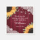 Dekorieren Sie Ihre bordeauxrote Hochzeitsfeier mit diesen eleganten botanischen Servietten mit Sonnenblumen und Grün auf einem bordeauxfarbenen Holz und einem spitzen Hintergrund mit Lichtern.