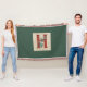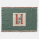 Illustrierter Buchstabe/Initial mit hellen Imitaten aus Holz quadratisch und grüner Hintergrund mit Stallrot gefüllt Letter H mit einem Aquarellarm aus Eukalyptus-Blätter.