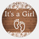 "It's a Girl" Babyaufkleber Rustikaler Stil mit holzgepolstertem Hintergrund und weißer Spitzendekoration. In unserem Shop sind weitere Artikel in diesem Stil erhältlich. Sie können das Design weiter bearbeiten, Farben, Schriftart ändern und zusätzlichen Text hinzufügen, indem Sie auf den Link "Weiter anpassen" klicken.
