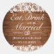 Essen, trinken und Verheiratet Hochzeitsaufkleber sein. Rustikaler Stil mit Holzvertäfelungen und weißer Spitzendekoration. In unserem Shop sind weitere Artikel in diesem Stil erhältlich. Sie können das Design weiter bearbeiten, Farben, Schriftart ändern und zusätzlichen Text hinzufügen, indem Sie auf den Link "Weiter anpassen" klicken.