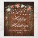 Das elegante Watercolor Poinsettia Flora Happy Holidays Weinflaschen Label umfasst schöne Aquarelltaschen, botanische Pflanzen, Winterpflanzen, heilige Beeren, weiße Rosen, Baumwolle, Kiefernfüße und blaue Beeren. Rustikales Land Holz und Streichelleuchten.