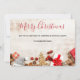 Eine flache Weihnachtskarte mit einem rustikalen Foto. Ein hellbraunes Holzbrett mit verschiedenen Weihnachtselementen am Boden. Weihnachtsgeschenke, ein Stern, ein goldener Weihnachtsbaum, Winterhut, Rentiere, Baubles und ein paar Urlaubssorten.