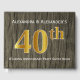 Dieses Gästebuchdesign weist die Ordnungsnummer "40." mit einem goldähnlichen Imitat auf. Es verfügt auch über individuelle Namen und ein rustikales Imitat Holz Hintergrund. Es könnte bei einem Party für ein verheiratetes Ehepaar zum vierzigsten Hochzeitstag genutzt werden.