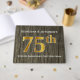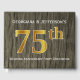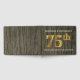 Dieses Gästebuchdesign weist die Ordnungsnummer "75." mit einem goldähnlichen Imitat auf. Es verfügt auch über individuelle Namen und ein rustikales Imitat Holz-Look Hintergrund. Es könnte in einem Party für ein verheiratetes Ehepaar verwendet werden, das ihren fünfundsiebzigsten Hochzeitstag feiert.