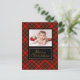 Ein gemütlicher karierter Hintergrund in Rot Set die Bühne für ein spielerisches Land Weihnachten Gruß für Familie und Freunde. Ändern Sie diese Karte und personalisieren Sie sie mit einem Foto Ihrer Familie mit einem gemusterten Hintergrund in Rot, Grün und Schwarz und auf der Rückseite mit Ihrem Gruß.