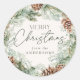 Elegante Ferienaufkleber mit einem Aquarellkranz aus Pinecones, Kiefernbäumen und üppiger Vegetation mit einem hellen cremefarbenen Hintergrund. "Frohe Weihnachten" wird in einem dunkelgrünen Skript angezeigt, in dem Ihr Name unten angezeigt wird.