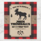 Ein Hintergrund aus rotem Büffel-kariert kontrastiert mit einem Kraftpapier-Look Panel, das an einem Burlap-Gurt befestigt ist. Die Tafel enthält die Party-Informationen mit einem Elch zwischen zwei Kiefern. Ideal für einen Geburtstag, eine Bachelor-Party, eine Saisonveranstaltung oder eine karierte oder lumberjack-Themenfeier. Die gekreuzte Axt macht unten ein individuelles Logo. Verfügbar mit passenden Produkten.