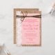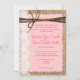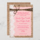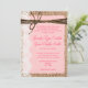 Rosa und braune Hochzeitseinladungen.Diese rustikale Hochzeitseinladung ist perfekt für jeden Western Hochzeit. Auf beiden Seiten der Einladung befindet sich ein rustikaler, ländlicher, bedruckter Oberboden. Die Einladungsschrift ist auf einem zertäfelten rosa Rechteck mit beidseitig bedruckter Spitzentechnik gedruckt. Die Oberseite ist mit einer bedruckten Garnelenverzierung versehen. Die Einbrecher, Spitzen und Zwirn sind nur bedruckte Designs. Es handelt sich nicht um ein quasi-belastetes Gewebe oder um einen tatsächlichen Spitzen- oder Zwirn.