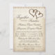 Einzigartige rustikale Landtypografie Hochzeitseinladungen mit zwei verflochtenen Herzen in der oberen Ecke auf einem bedrückten antiken Papier Hintergrund Design mit einem gedruckten weißen Spitzen-Design an der Spitze. Das gleiche doppelte Herz und das Vintage Papierdesign sind auch auf der Rückseite, außer die Herzen sind in der unteren Ecke. Die Schriftart-Schrift ist eine niedliche Kombination von Schriftart für ein typografisches Aussehen. Diese sind ideal für rustikale Hochzeiten in Land und Western. Matching Items: rustikale Hochzeitseinladungen, Hochzeitseinladungen auf dem Land, Einladungen für Western auf dem Land, einmalige Hochzeitseinladungen, antike, Vintage Ankündigungen von Hochzeitsfeiern, Doppelherzen, verflochtene Herzen, Vintage Herzeneinladungen. Vintage Hochzeitseinladungen.