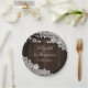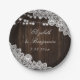 Elegante und romantische rustikale Hochzeitsfeier Teller inspiriert von Stallholz, weiße Blumenspitze und Lichter an der Saite.