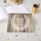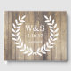 Rustikales Gästebuch mit einer Silhouette mit weißen Lorbeeren, die die Initialen Ihres Paares und das Hochzeitstag mit einem hellen Holzstall-Hintergrund umreißt.