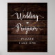 Rustikales Bauernland, dunkelbraunes Holz, schwarzer Schriftart, Hochzeitsprogramm, bitte ein Poster/ Schild mitnehmen.