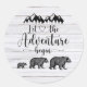 Rustikale Wanderbärenfamilie ließ das Abenteuer beginnen Babyduschaufkleber, auf einem Holzboden. Kalligrafie mit Herz.