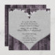 Diese Hochzeitseinladung enthält ein Hintergrundbild aus rustikalem lila Farbholz, ein graues Leinenherz und ein weißes Blumenmotiv. Shabby, aber chic.