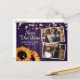 Diese rustikale Hochzeit bewahrt das Datum Foto Postkarten mit Sonnenblumen auf einem Stallholzboden sind ideal für eine lila rustikale Hochzeitsfeier inspiriert von Sonnenblumen.