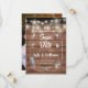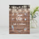 Verfügt über Saitenleuchten über einem künstlerischen Mauerkessel, der mit personalisierten Save the Date Details gefüllt ist und verstreut empfindliche Blume auf einem rustikalen Holzpaneelhintergrund. Auf der Rückseite befindet sich Ihr spezielles Foto. Entwickelt von Thisisnotme©
