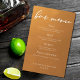 Dieses rustikale Hochzeitsmenü aus Gold zeichnet sich durch eine elegante, weiße Typografie aus, die auf einem untertönten Farbverlauf der Erde überlagert ist. Im Herbst folgen die Trends für eine böhmische Hochzeit in einfachen, hellen Orange- und Brauntönen. Füllen Sie den Look mit Ihrem minimalistischen Skript über die Farbe verblassen auf dieser Getränkeliste.
