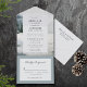 Elemente: Aquarellmalerei des rustikalen Bergsees im Winter; elegante Serifen und serifenlose Schriftart. Farben: Blau, Grün, Grau, Weiß, Offweiß. Themen: Berge, Seen, Hochzeit im Freien, Winterhochzeit, elegant, rustikal, impressionistisch, Aquarell, schneebedeckte Berge. Sammlung: Rustikale Hochzeitssammlung über den Bergsee. Art des Produkts: Einladung