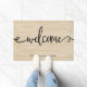 Diese Fußmatte kennzeichnet einen rustikalen, Leinenleinwandblickhintergrund und eine moderne schwarze Typografie, die "Willkommen" sagt.