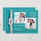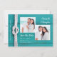 Rustikale Karte zum Thema Wassersport. Der Hintergrund hat eine türkisfarbene oder aquamarine Holzstruktur. Ein nautischer Knoten spielt auf niedliche Weise mit den Worten "den Knoten binden". Zwei Fotos der beiden sind im Mittelpunkt dieses auffälligen Designs. Diese Karte ist trendig und unisex. Ideal für eine Hochzeit zum Thema Wassersport, eine Hochzeit am Strand oder eine Hochzeit in Urlaubsort. Ideal für Bootsliebhaber und Segler.