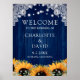 Romantische rustikale marineblaue Begrüßungsschild mit Sonnenblumen und Babyatematsche Blume vor rustikalem Holzfußboden mit weißer Blumenspitze und Lichtern an der Saite. Matching-Elemente verfügbar.