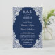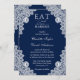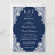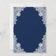 Begleiten Sie Ihre marineblaue Hochzeitsfeier mit den eleganten und romantischen Einladungen mit weißer Blumenspitze auf marineblau-blauem Hintergrund.