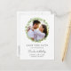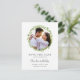 Rustikale Save the Date Postkarte mit Ihrem Foto in einem grünen Olivenblatt Kranz. Ihre Namen befinden sich in einem handgeschriebenen Skript-Schriftart und Ihre Daten in einem mittelgrauen Schriftart auf der Rückseite. Dieses Design ist ideal für eine Hochzeit im Sommer.