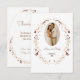 Feiern Sie Ihre Liebe mit dieser rustikalen Blumenkarte, die Eleganz und natürlichen Charme verbindet. Das ovale Foto, umgeben von einem zarten botanischen Kranz in gedämpften Creme-, Taupe- und Bordeaux-Tönen, ist ein Set für einen romantischen und raffinierten Tag. Der weiße Hintergrund hebt die warmen, erdigen Blumenelemente hervor, während das anmutige Drehbuch und die Serifentypografie eine Touch zeitloser Klasse hinzufügen. Ideal für rustikale Hochzeitsfeiern, Gartenfeiern oder Hochzeiten mit dem Thema Boho. Vollständig anpassbar mit Foto, Namen, Datum, Veranstaltungsort und UAWG. Ein schöner erster Eindruck für Ihre Gäste.