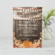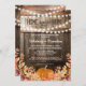 Rustikale Herbstwärmende Party Einladungen mit einem Stallenholzfass-Hintergrund, blinkenden Saitenleuchten, Herbstlauben, einem Erntekürbis und einer Zuhause-Party-Vorlage, die leicht zu personalisieren ist.