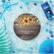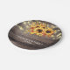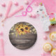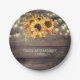 Rustikale Ruhestand Party Papier Teller mit Aquarellsonnenblumen und Streichelleuchten auf einem Holzboden. Rustikaler Feststil für Ihre Feier.