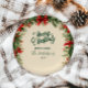 Ein festliches Weihnachtsdesign gerahmt mit klassischen roten Poinsettien, Kiefernästen und Wintergrün. Der rustikale Vintage Stil spiegelt die Wärme und Gemütlichkeit der Urlaubssaison wider, die perfekt für ein traditionelles Weihnachtsfest ist.