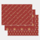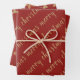 Ein elegantes Set von drei aufeinander abgestimmten Verpackungsfolien in einer festlich verbrannten Rot- und Goldpalette. Man hat frohe Weihnachten in einem modernen, handgeschriebenen Schriftart geschrieben. Die zweite ist mit einem abstrakten Weihnachtsbaummuster versehen und die dritte Platte hat ein Schneeflockenmuster.
